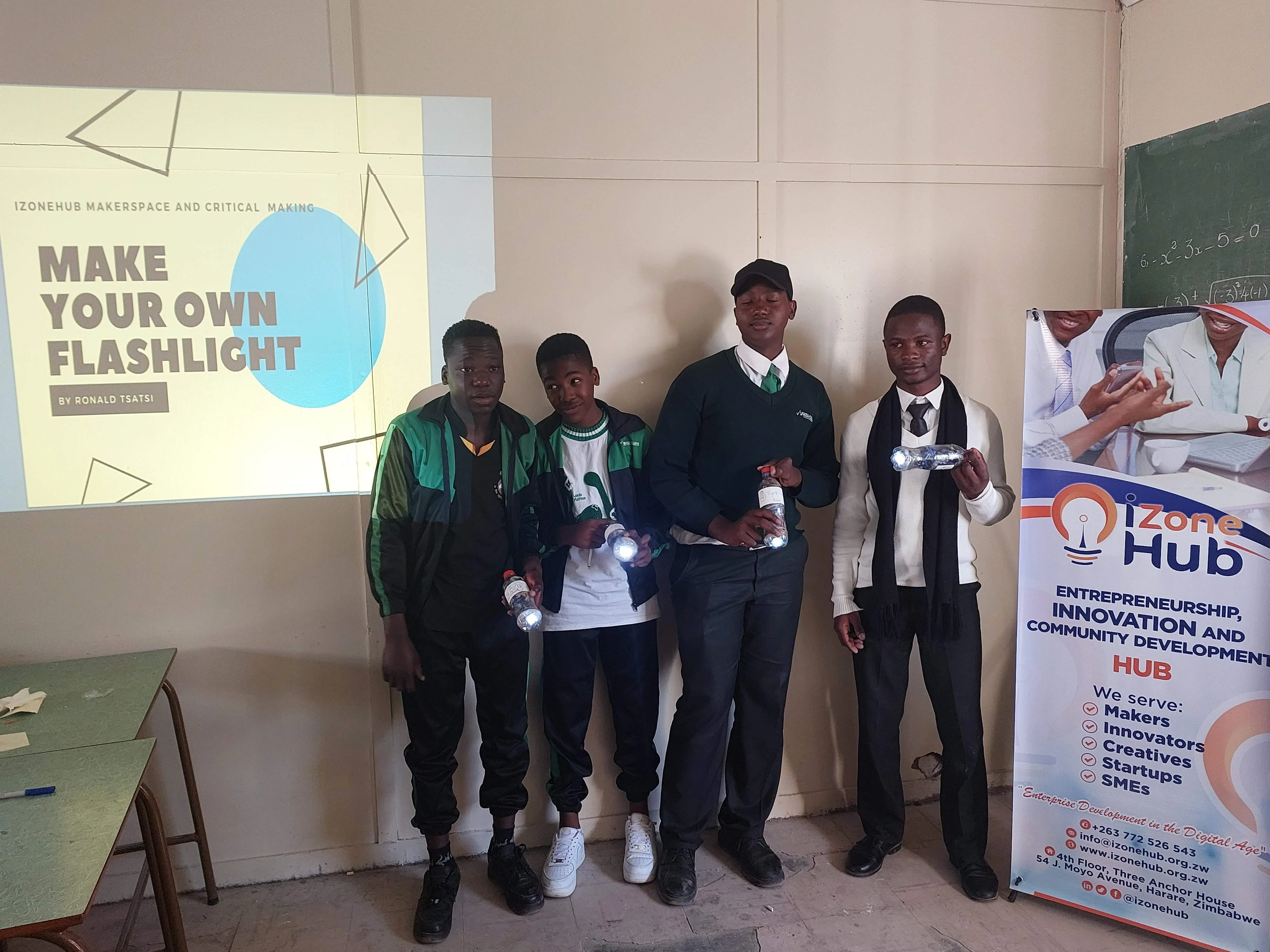 The DIY Flashlights workshop was held at Speciss College Chitungwiza campus, bringing together high school students eager to learn about electronics and sustainability. Participants were guided through the process of creating functional flashlights using recycled PET bottles and basic electronic components. The workshop provided an opportunity for students to engage in hands-on learning, understand the importance of reusing materials, and develop problem-solving skills.